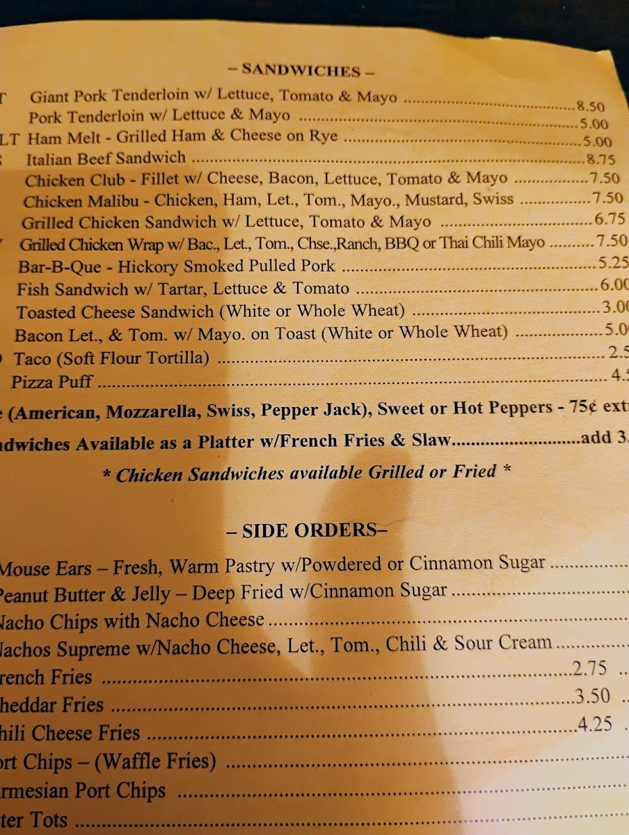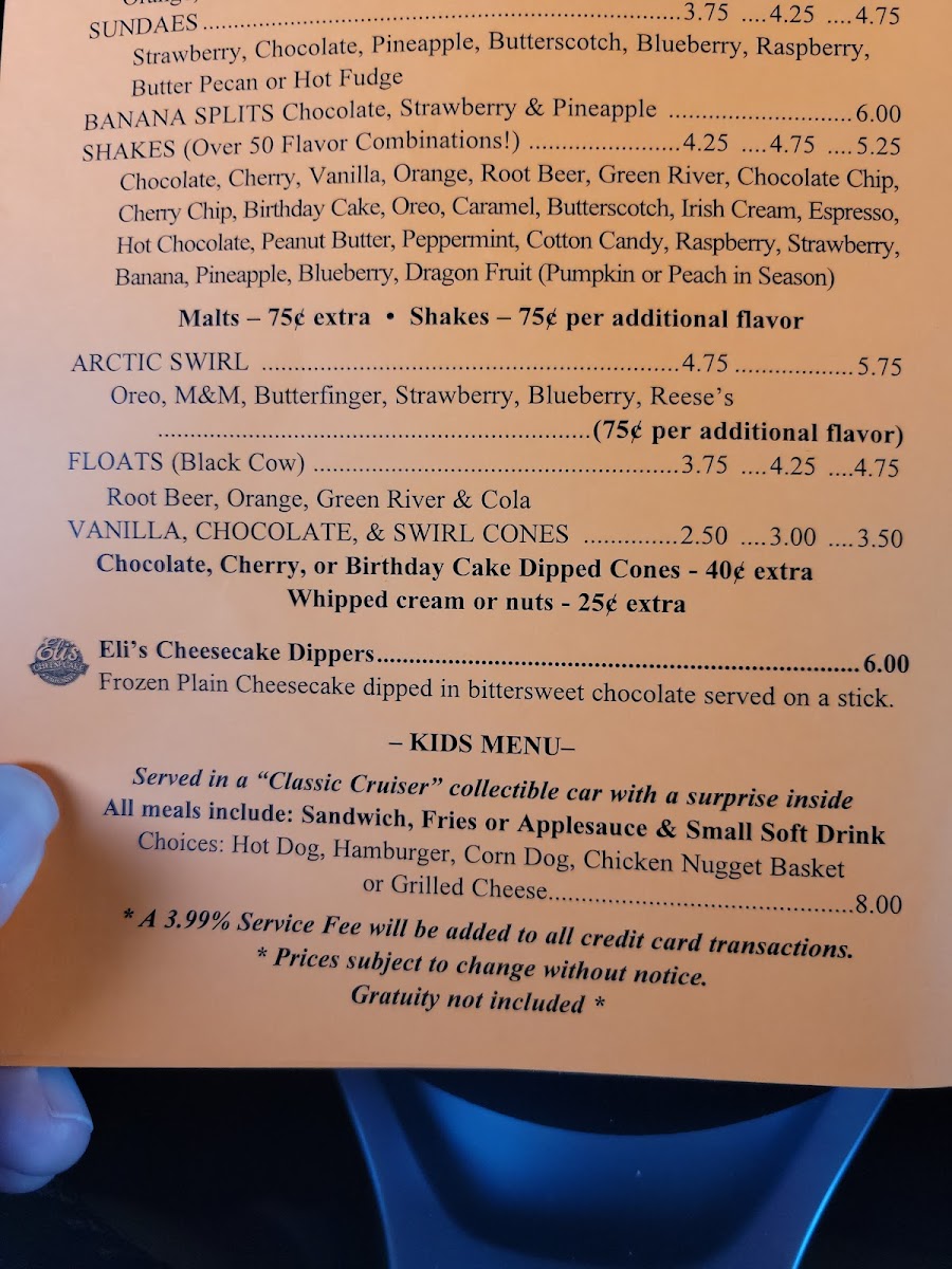 shakes (over 50 flavors!) chocolate, cherry, vanilla, orange, root beer, peanut butter, peppermint, etc